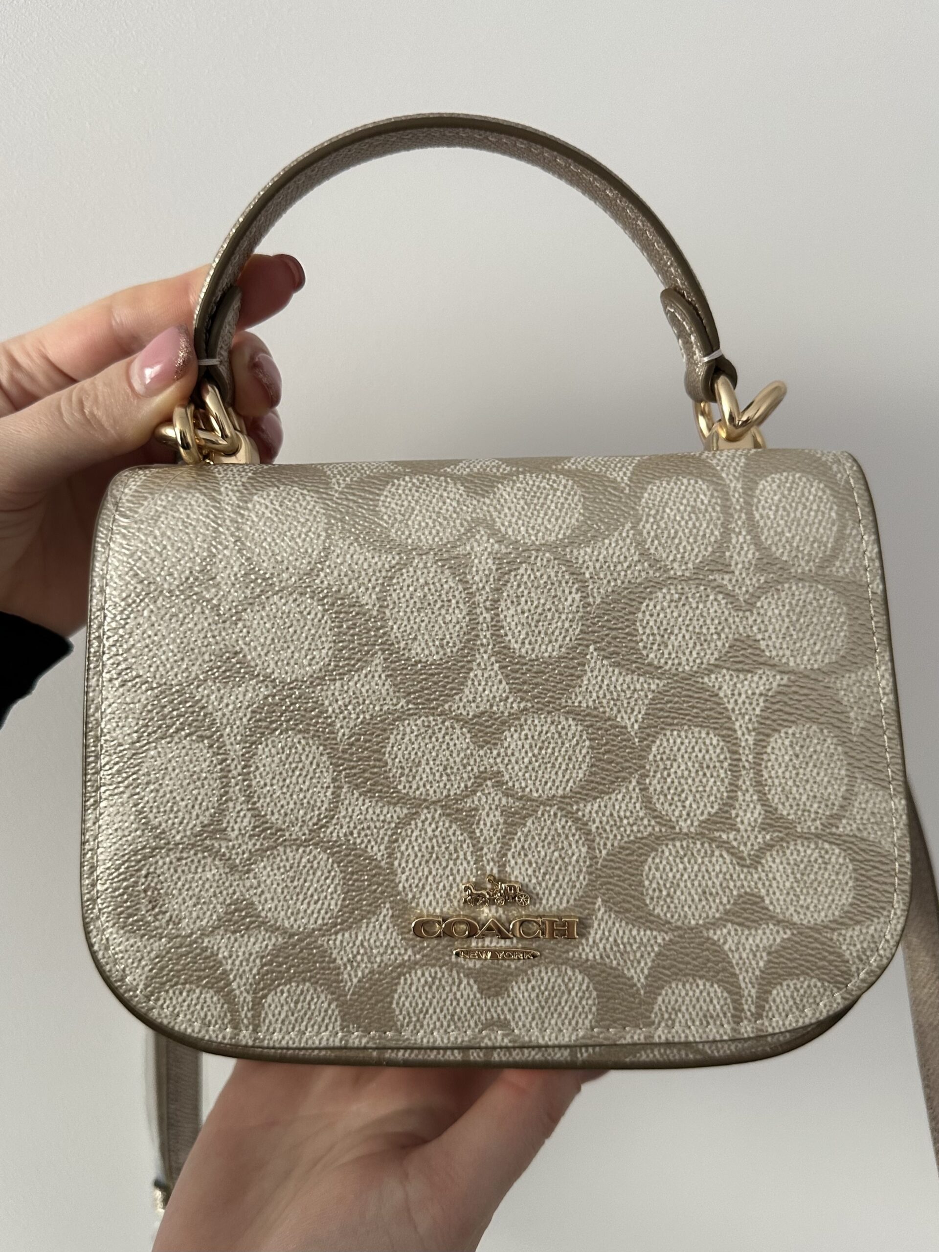 Lysa — це компактна сумка з елегантним верхнім тримачем, яка в новій версії отримала перламутрове покриття Signature Canvas і металізовану зернисту шкіру. Завдяки м’якому блиску та золотистій фурнітурі, модель виглядає святково, але залишається практичною. Ідеальна для вечірніх виходів або як акцент у денному образі. Носити можна в руці або на плечі — ремінець знімається та регулюється.