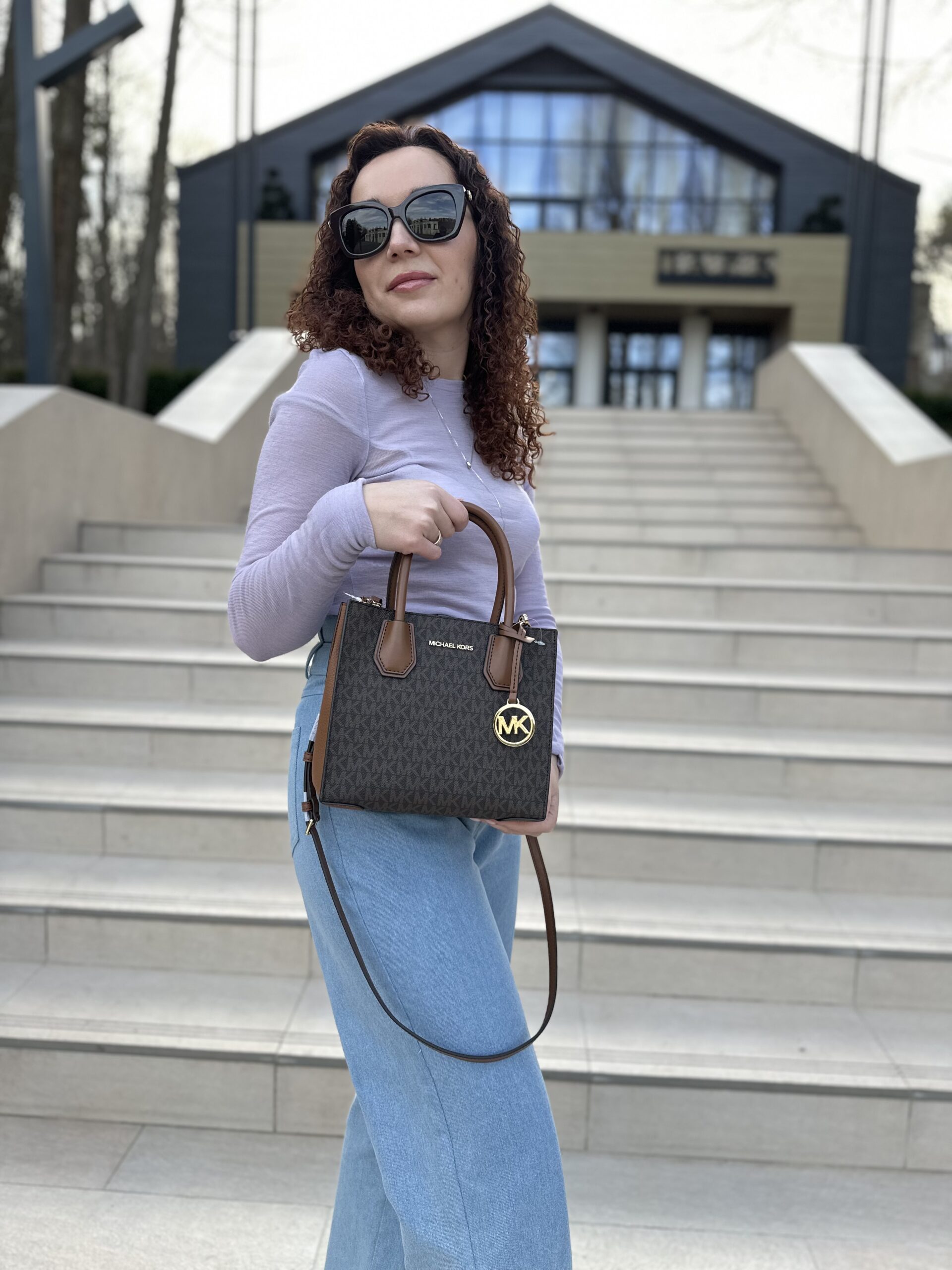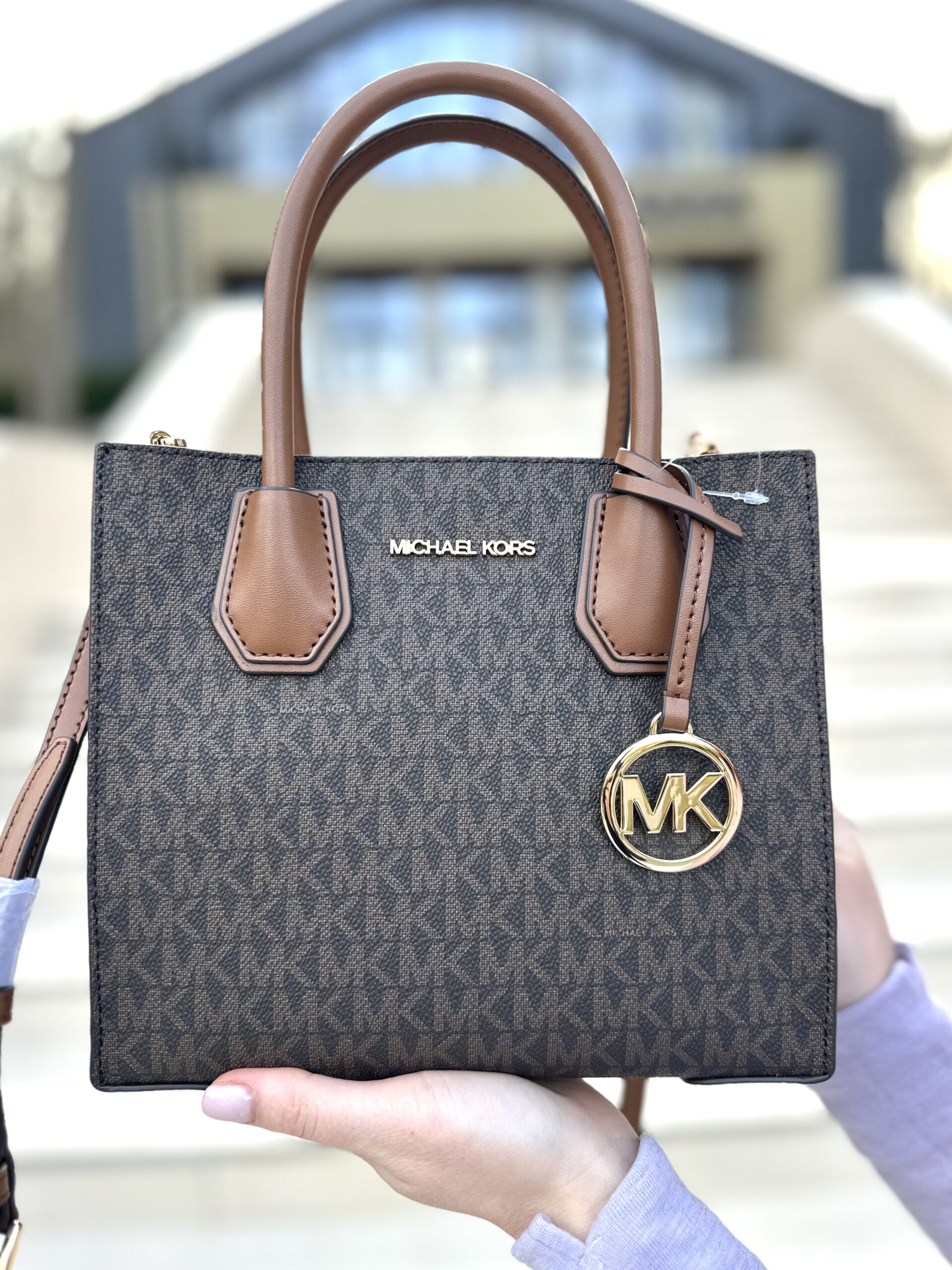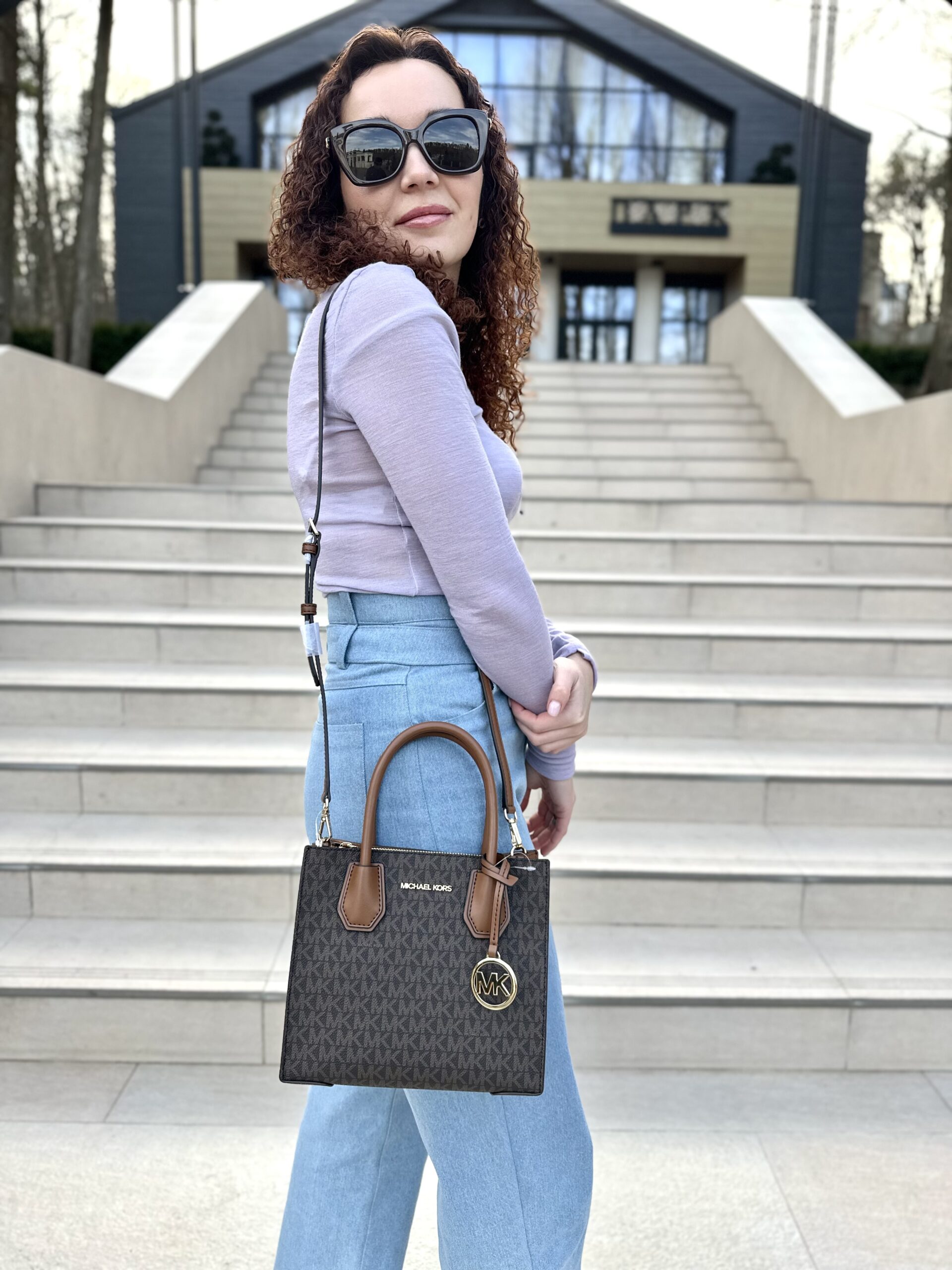 Mercer Medium Logo and Leather Accordion Crossbody Bag – жіноча сумочка Michael Kors у коричневому логопринті