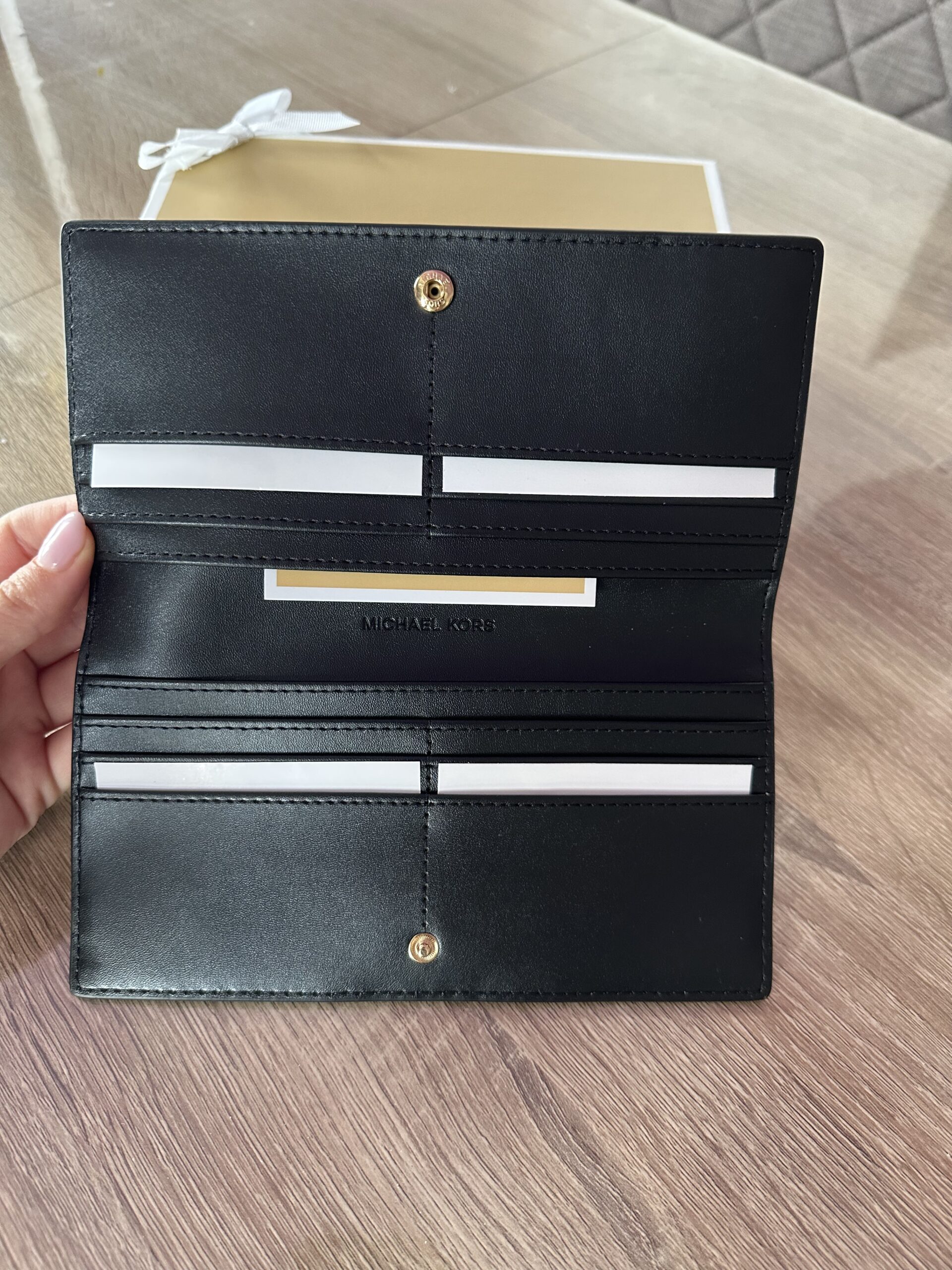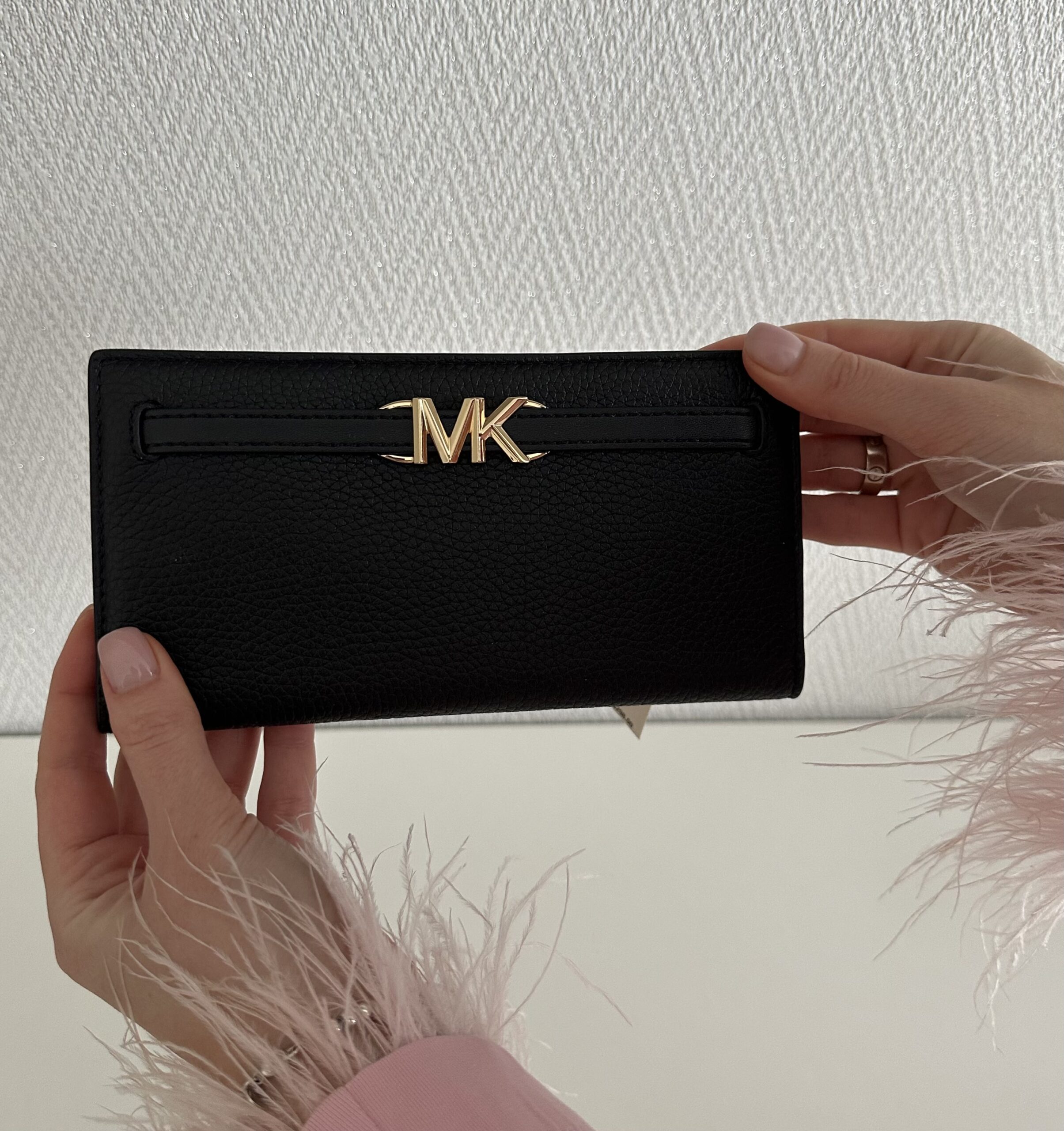 Reed Large у кольорі Black — це елегантний гаманець із зернистої шкіри, оздоблений глянцевою фурнітурою “MK” та декоративним ремінцем. Класичний чорний відтінок і золота фурнітура створюють стриманий, але розкішний образ. Усередині — 12 слотів для карток, відкриті кишені для квитанцій і документів, а ззаду — кишеня на блискавці для монет. Ідеальний аксесуар для щоденного використання або подарунка.